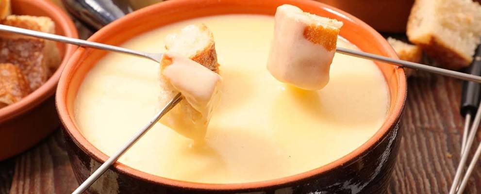 You probably haven’t dusted off your fondue set for a while – in the UK this dish has largely been confined to memory alongside other remnants of the 1970s like platform shoes, hot pants and the Space hopper. Not so in Switzerland, and if you decide to travel here you’re more than likely to find yourself dipping into a big bubbling bowl of cheese with your dining companions, in fact it’s an absolute must on Swiss holidays. Here, ‘la fondue’ means a cheese fondue, not meat or anything else. A fairly shallow round pot is used, and in it goes a cheese sauce usually made up of two or more types, with Gruyère a must, as well as white wine, Kirsch, a little garlic and lemon juice. Only bread is dipped into the fondue, cut into cubes, which you spear on your long, thin fork.