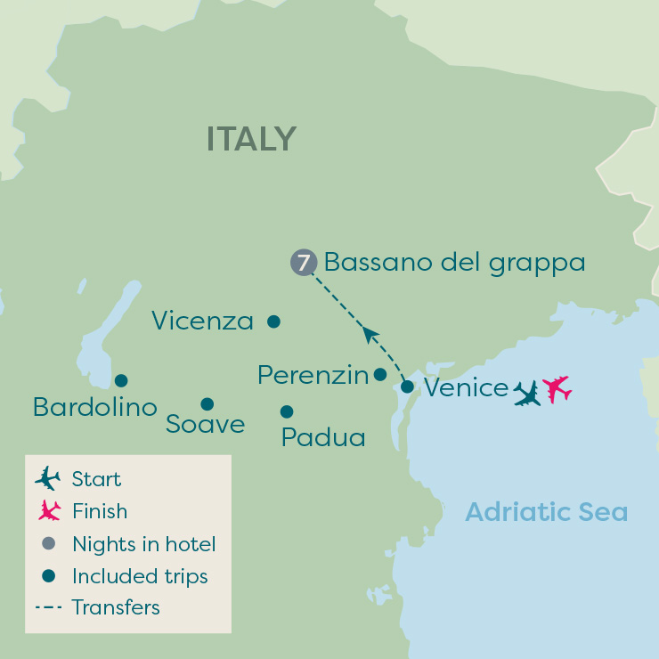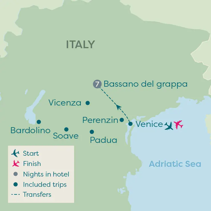 Discover the enchanting heart of northern Italy on this eight-day journey through Veneto's most captivating destinations. This carefully crafted tour takes you beyond the tourist trail to Palladian Villas, historic towns and renowned vineyards. From the medieval charm of Bassano del Grappa to the floating romance of Venice, savour distinctive wines along the White Wine Road, Lake Garda, and the volcanic Euganean Hills, while visiting family-run producers and enjoying authentic food experiences. Wander fairytale towns like Asolo and Marostica, admire Palladian masterpieces, and connect with fellow travellers. With a perfect balance of guided discovery and free time to explore at your own pace, this is Veneto at its finest.
