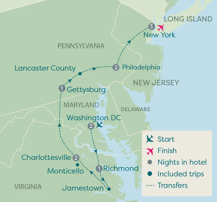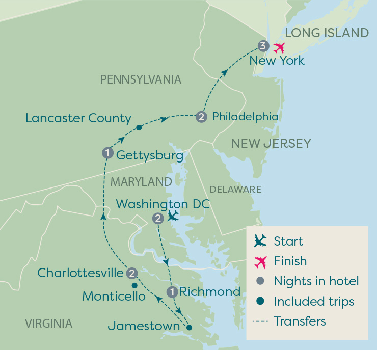 Later we’ll head south to the state of Virginia and the city of Richmond, capital of the Confederacy during the American Civil War. Today, Richmond is a buzzing city, located on the banks of the James River. Here, you will find the Virginia State Capitol, a building designed by Thomas Jefferson and if it's fashionable shops and restaurants you crave, be sure to make a beeline for the historic district of Shockoe Slip.