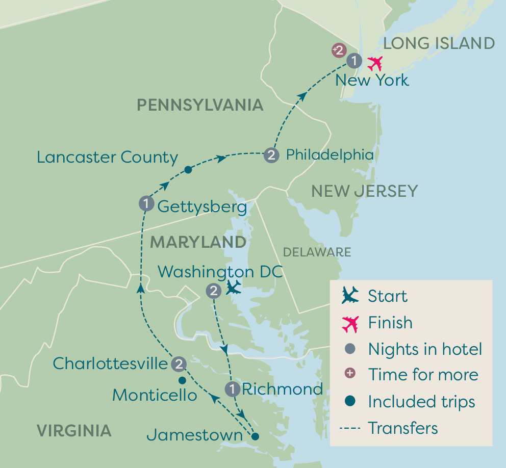 Later we’ll head south to the state of Virginia and the city of Richmond, capital of the Confederacy during the American Civil War. Today, Richmond is a buzzing city, located on the banks of the James River. Here, you will find the Virginia State Capitol, a building designed by Thomas Jefferson and if it's fashionable shops and restaurants you crave, be sure to make a beeline for the historic district of Shockoe Slip.