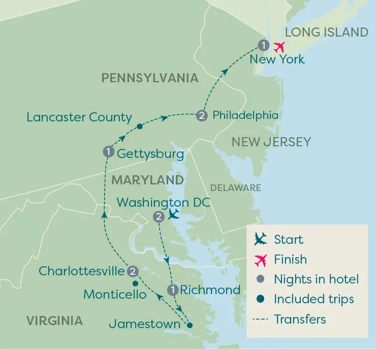 Today you're going to experience 17th Century Virgina, visiting Jamestown Settlement where America’s first permanent English colony was established in 1607. The site demonstrates what daily life was like for the early colonists, the Virginia Indians who lived on the land for centuries, and the first documented arrival of West Central Africans in 1619. Later we’ll move on to Charlottesville, Virginia for a two-night stay.