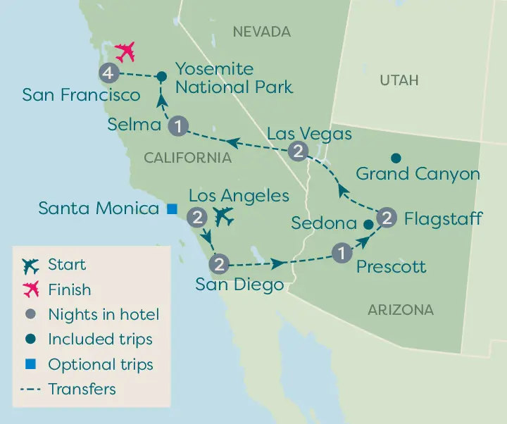 Hollywood, the Grand Canyon, Las Vegas, Yosemite National Park and San Francisco, this tour visits some of America's best-known places! In LA, we'll walk along star studded pavements, before heading through the desert to Arizona. We'll continue to the Grand Canyon, a must-see site, which you could opt to take a helicopter flight over. We'll then travel along the legendary Route 66 to the bright lights of Las Vegas, which looks like a mirage in the desert as the lights begin to appear as you draw closer. Taking in the spectacular natural beauty of Yosemite National Park is next, where you'll have time to explore. Finally, we'll travel across the Golden Gate Bridge and visit the coastal city of San Francisco, where your extended stay allows you a few extra days to make your own discoveries before heading home.