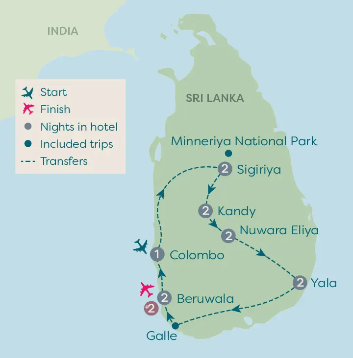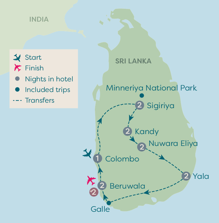Discover this paradise island teeming with wildlife, incredible landscapes and a colourful culture. Start in Sri Lanka's capital Colombo, a bustling metropolis where colonial-era buildings and Buddhists temples rub shoulders with modern skyscrapers. Visit Minneriya National Park, home to elephants, deer and wild boar, before heading to see the spectacular rock fortress of Sigiriya which features the impressive Lion Gate. Next, visit Kandy, the location of Travelsphere Cares Project Sthree Café, which you'll visit, as well as the Temple of The Sacred Tooth – the most venerated place of worship for Buddhists in the world. Continue your discoveries in the hills of Sri Lanka where you'll have a tour of a tea plantation, and venture to Yala National Park. Your last stop is Beruwala, home to one of the longest beaches in Sri Lanka, where you can enjoy some relaxation at the end of your tour.