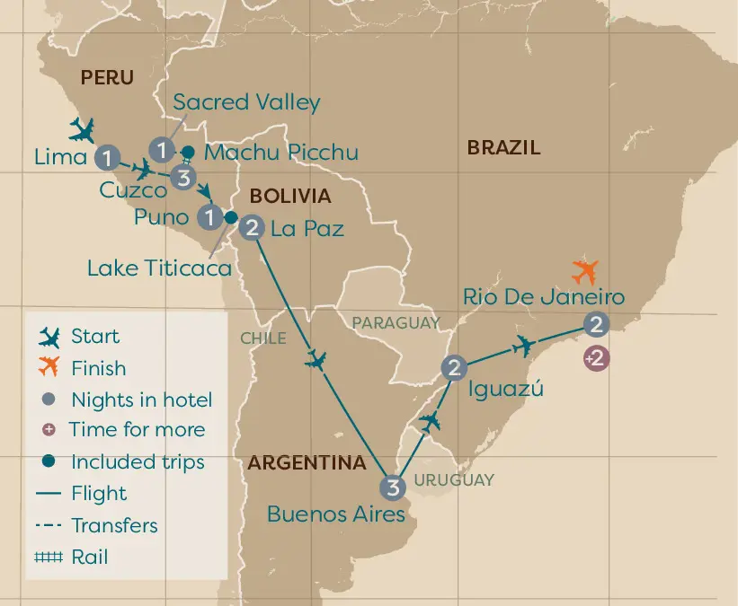 If you're feeling adventurous this is the tour for you. Over 18 action-packed days you'll experience many thrilling highlights as you journey to Peru, Bolivia, Argentina and Brazil. Tour Lima, the 'City of Kings', and Cuzco, once the capital of the Inca Empire, and discover the iconic 'Lost City' of Machu Picchu, nestled on a mist-shrouded mountain. Further incredible sights in Peru include the snow-capped Andes and Lake Titicaca, before you head into Bolivia, where La Paz is home to many intriguing gems. On to Argentina's capital, Buenos Aires, where a tour includes the Plaza de Mayo and Recoleta cemetery. Next you've the chance to visit the stunning Iguaçú Falls from both the Argentinian and Brazilian sides for extraordinary views. Your tour comes to an end in the exciting city of Rio de Janeiro, where you can discover the statue of Christ the Redeemer from your hotel, which is located on Copacabana Beach.