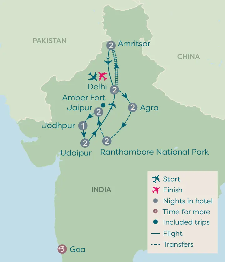 Experience the very best of the Golden Triangle - visit the highlights of Delhi including a rickshaw ride through  Chandni Chowk, see the majestic Taj Mahal at sunrise, and the 'Pink City' of Jaipur. Venture into Ranthambore National Park to go in search of the elusive Bengal tiger and delve into the cultural highlights of India’s Rajasthan with stays in Udaipur, Jodhpur and Amritsar exploring incredible sights such as the Mehran Garh Fort and the Golden Temple. And if that wasn't enough, an evening cruise on Pichola Lake will take yo to Jagmandir Island where sandstone palaces appear to rise from the water. Complete your Indian adventure with 3 nights in Goa, where you can relax on the coast of the Arabian Sea.