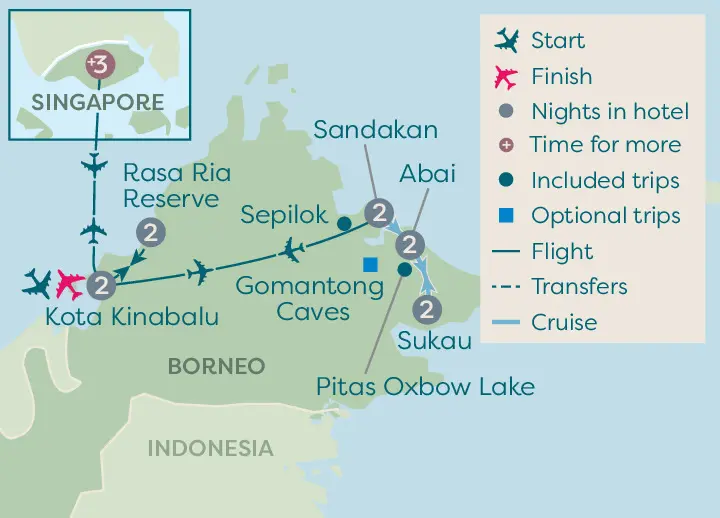 Head into the jungle and rainforests of Borneo for the chance to spot orangutans and pygmy elephants in the wild. Before heading homewards spend three nights in Singapore for a ...