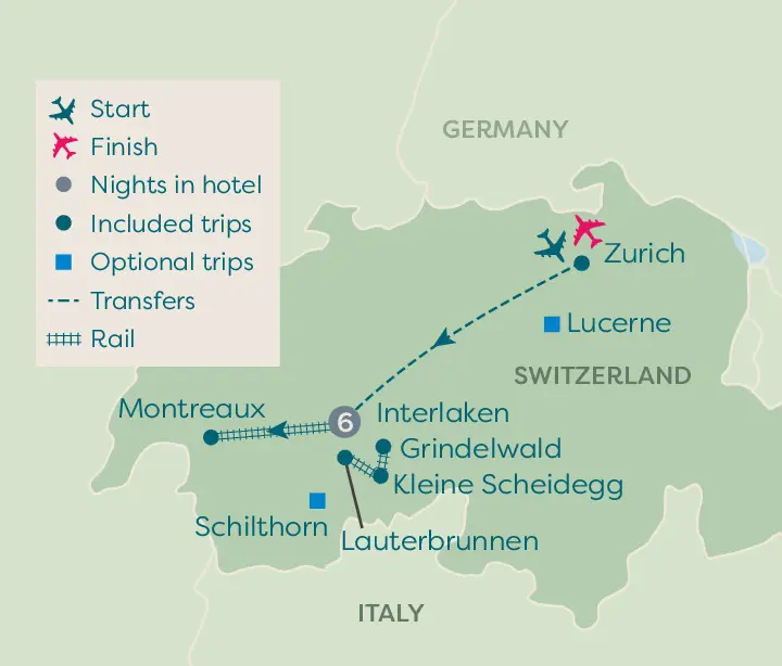 For those seeking one more Swiss adventure, join our optional rail adventure to Lucerne travelling aboard the panoramic Luzern-Interlaken Express. This stunning two-hour journey follows the shores of shimmering lakes, passes through traditional villages, and offers constantly changing mountain vistas – simply sit back and enjoy the view from your window.